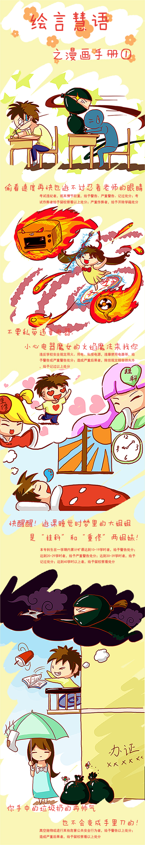 “引导学生遵守校规校纪,关注学生校园生活状况”历来是南航辅导员的职责所在。为了更好地向学生传达学校纪律以及校园生活的种种窍门,近日,我院11、13级辅导员陈慧云在其微博及微信平台上发表了自创的漫画版学生手册,受到了《金陵晚报》《现代快报》等纸质媒体的刊载报道,并得到了人民网、中国广播网、中国江苏网等20多家网络媒体的转载报道。