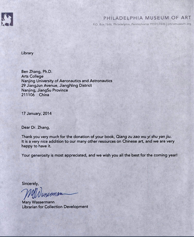 我院美术系张�副教授2013年2月出版的专著《羌族造物艺术研究》于2013年年底被美国费城艺术博物馆作为馆藏图书,并于近日收到美国费城艺术博物馆馆藏建设发展部的签字确认信。