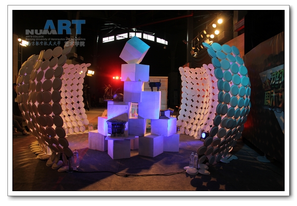 小屋的外形类似机舱,凸显南航的航空航天特色。弧形墙体由百张一次性纸盘组合搭建而成,由废弃的纸箱搭建成具有艺术感的几何图案作为中心展台,涂上绿色环保涂料之后外形神似南航主楼。太空舱门口还摆放了由上百个塑料瓶拼成的一米高的四个字母――NUAA,正是南航校名的英文缩写。除此之外,南航的同学们还结合不同时代的背景设计创作了不同类型的建筑,从青铜器老房子到太空舱,跨越时空却处处彰显南航特色。