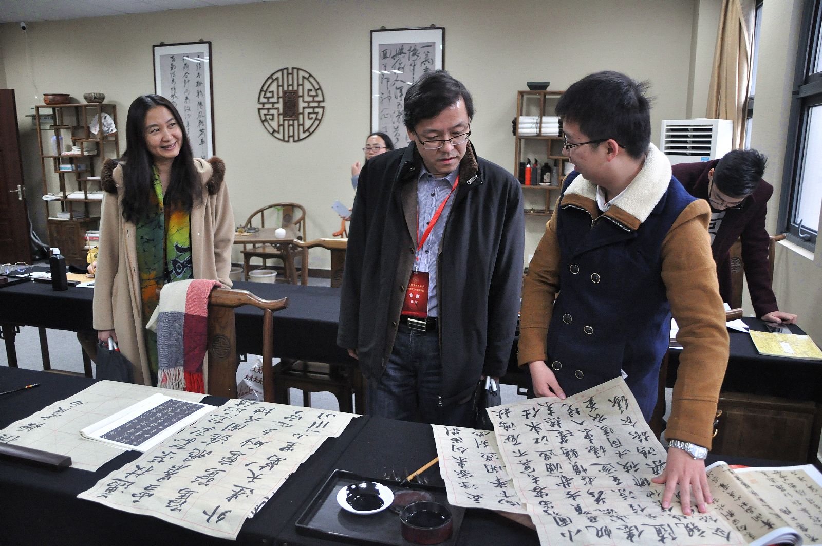 专家组考察创意工场,图为美术系系主任李伟老师向专家组进行介绍
