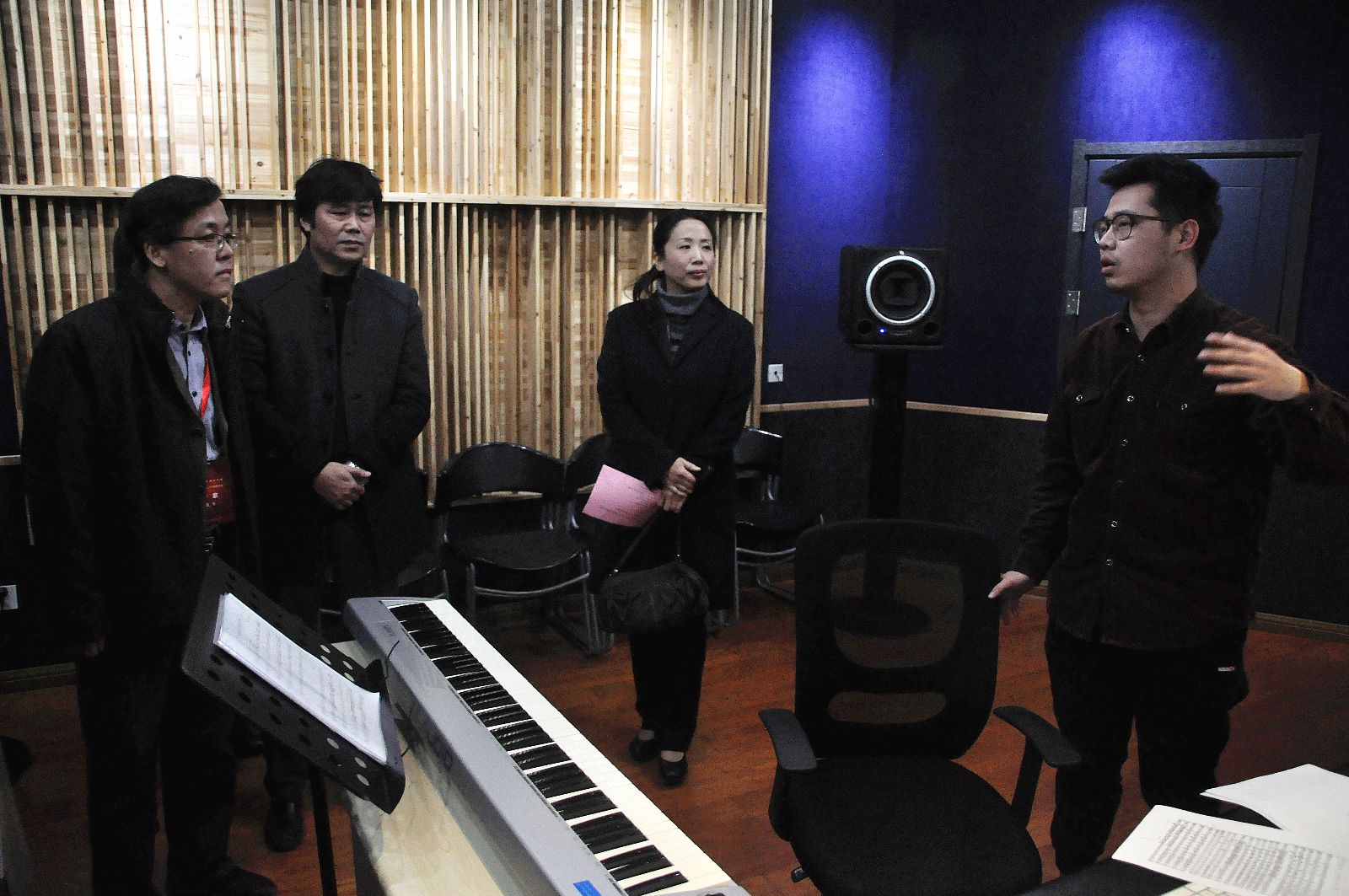 专家组考察yl23411永利集团官网数字音乐实验室,图为工作人员向专家组介绍该实验室情况