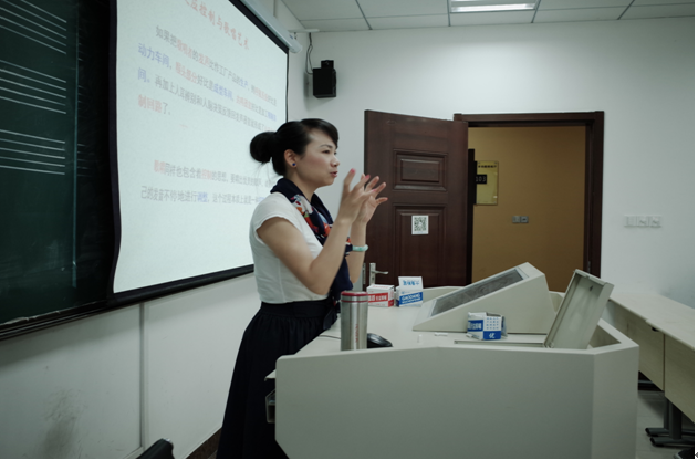 该课程大部分时间都是让学生在“学中练、练中学;练中闯、练中创”。邱爱金老师让学生上台与她一对一地互动,同时将20名学生分成10个小组,一对一互相练习发声、气存丹田等歌唱技巧,让学生互相体会和测试控制在歌唱艺术中的应用。起初同学们还有些害羞,但是在邱老师耐心和蔼的指导下,大家渐渐鼓起勇气,伴随着钢琴的节奏积极主动地练习发声,体会控制与歌唱的关系。