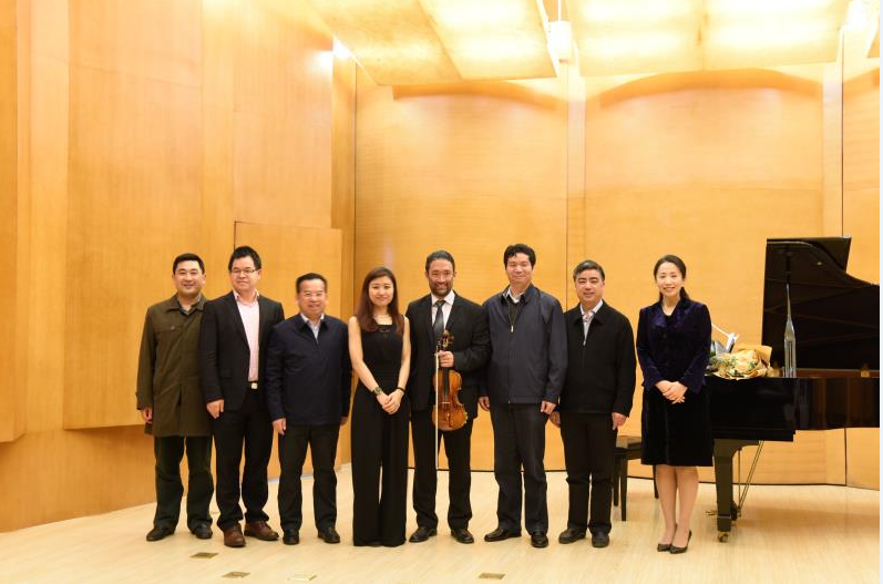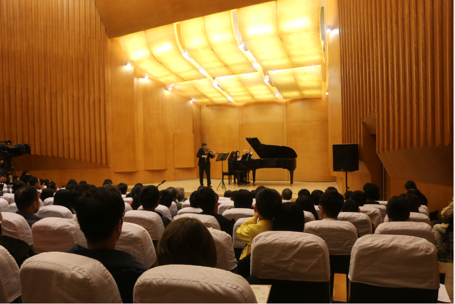 演奏会开场前,yl23411永利集团官网张捷院长介绍了本次音乐会的背景和初衷,随后莫扎特《小提琴奏鸣曲》(OP No.454)拉开了音乐会的序幕,优美舒缓的琴声环绕在整个音乐厅。演奏家赫登伯格以国际顶尖级演奏家的艺术素养阐释着每一部音乐作品等深层内涵,琴弓在琴弦上时而跳跃飞舞,时而缓慢行进,时而又与钢琴亲切对话,轻快、曼妙的琴声在钢琴的烘托下令人心旷神怡。两位音乐家深深地沉浸于音乐演奏中,他们随着音乐的旋律律动着、陶醉着,尽情地让音乐这一没有国界的音声艺术带给观众完美的听觉感受。音乐会现场,观众们陶醉于原汁原味的古典音乐中,有人不时拿出手机记录下这美妙的时刻。十几分钟的莫扎特奏鸣曲之后,两位演奏家又经典演绎了弗里茨.克莱斯勒的《爱之忧伤》和《爱之喜悦》、理查.史特劳斯的《玫瑰骑士之圆舞曲》、贝多芬的《春天奏鸣曲》等作品。柔美、悦耳的琴声在音乐厅交相辉映、完美融合、荡气回肠,每首演奏曲目结束都迎来经久不息的掌声。