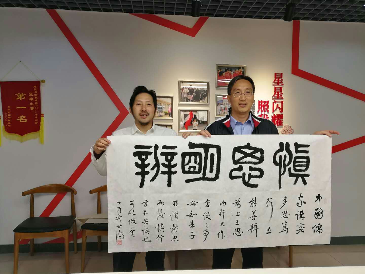 研讨会两天四场,每场举行现场互动和问答,对许多问题进行深刻探讨。会议期间,邱世鸿对印坛,书坛耆宿多所请教,对印坛书坛新锐多所交流,并向好学者赠送自己的最新论文集。在空余时间与南京代表参加了正斋书画院。27日,邱世鸿教授与《书法导报》编辑尧远生到达东莞横沥,参观了横沥文联邱世鸿工作室,横沥国税局,逸颐艺舍博物馆,寒溪河,东江等地。并应邀为国税局领导办公室写廉政建设之题词,名句,获得大家好评。五体俱运,八法兼工,力求精妙。写正能量之警句,挂在显眼位置,必须是艺术性与实用性节后,雅俗共赏。空闲之时,邱教授给新任领导,著名医生,服务行业等题词题字,因人而异,不作敷衍,务求精美。横沥期间,横沥文联主席吴炳晟,东坑书协主席卢启麟全程陪同,邱世鸿教授与吴主席商谈了“大美横沥”文化礼品的设计包装,与卢主席商谈了“启斋游艺”的教学培训计划,并题写了主题。