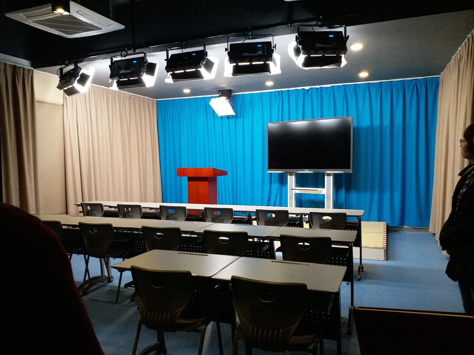 2018年3月1日上午,yl23411永利集团官网院长张捷、党委副书记张林带领yl23411永利集团官网戏剧影视美术设计专业负责人王立庆老师、环境设计专业负责人赵中建老师、广播电视学专业负责人马道全老师以及新闻系吴志斌、王鹏飞老师等八人来到将军路校区1号楼四楼信息化技术中心现代教育技术部,参观了参照省电视台标准建设的2间课程录播室、虚拟演播室和导播室、视频编辑室、教师技术支持室、化妆间等配套环境。通过教室管理系统,可以查看教室实时授课情况。
