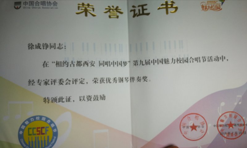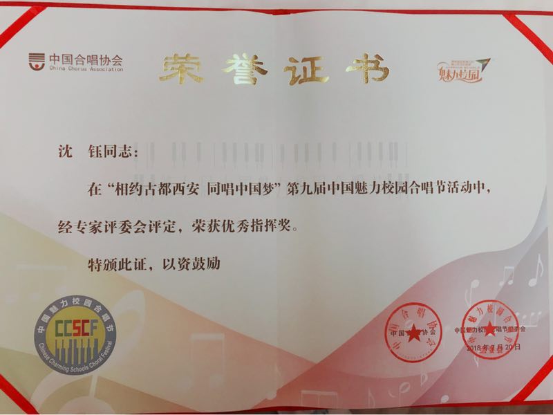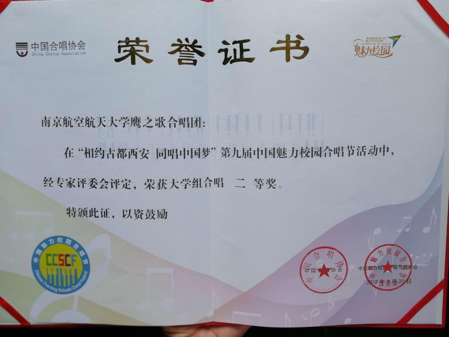 7月18日,第九届中国“魅力校园”合唱节在西安音乐学院落下帷幕,南京航空航天大学鹰之歌合唱团在全国76个合唱团激烈角逐中脱颖而出,荣获大学组第三名,二等奖。合唱团指挥、yl23411永利集团官网2016级合唱指挥方向研究生沈钰同学获得优秀指挥奖,来自民航飞行学院的徐成铮同学获得优秀钢琴伴奏奖。