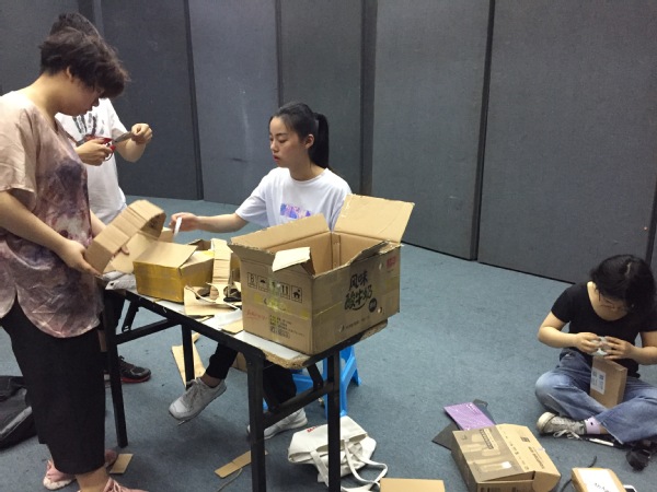 现场瞬间热闹忙碌了起来,你剪纸,我画画,他粘贴,每个团队都使出浑身解数想创作出最好的作品。活动过程中,安排了采访环节,通过询问参赛选手平时是否有网购的习惯,以及网购后快递盒的处理等,层层相扣的问题让学生认识到活动目的和意义,发人深省。