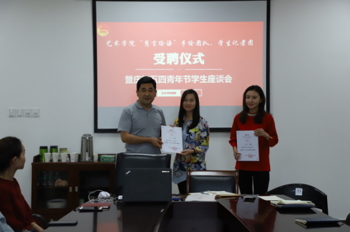 随后,学院邀请李倩岚老师和陈慧云老师担任两支学生团队的指导老师,并由学院党委书记高小泽老师为两位老师颁发聘书,高书记和两位指导老师也共同为两支团队新成员颁发聘书并合影留念。一张张笑脸上洋溢的是学生们对专业的热爱,更是对在团队中实现自身价值的满足与幸福。学生记者团付裕同学说:没想到,自己在青年节即将来临之际收到了这样一份沉甸甸的礼物,这不同于以往的节日祝福,这更像是一份责任,光荣也艰巨。