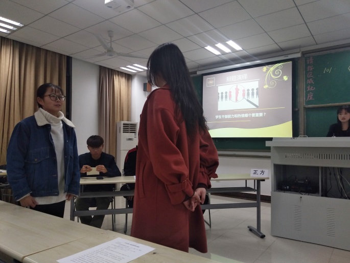 在两场辩论中,围绕“举办团活动质量和数量哪个更重要”这一辩题,音乐表演(歌舞)专业三名同学持正方观点,落脚于保质量增支持,提高同学对团日活动的认同感。而环境设计专业学生持反方观点,认为“通过数次的量的积累,可以充分调动每位同学的主观能动性,可以大大促进集体凝聚力与同学们的集体荣誉感,并为以后开展更加高质量的优秀团日活动铺平了道路”。在第二场辩论 “学生干部能力和热情哪个更重要”辩论中,各位辩手旁征博引妙语连珠,分别结合理论与现实论证了能力与热情的重要性,双方针锋相对互不相让,为大家奉献了一场有理有据的精彩辩论。经过五个环节的激战,最终1118401与1118501两个班级取得了这次辩题的胜利。