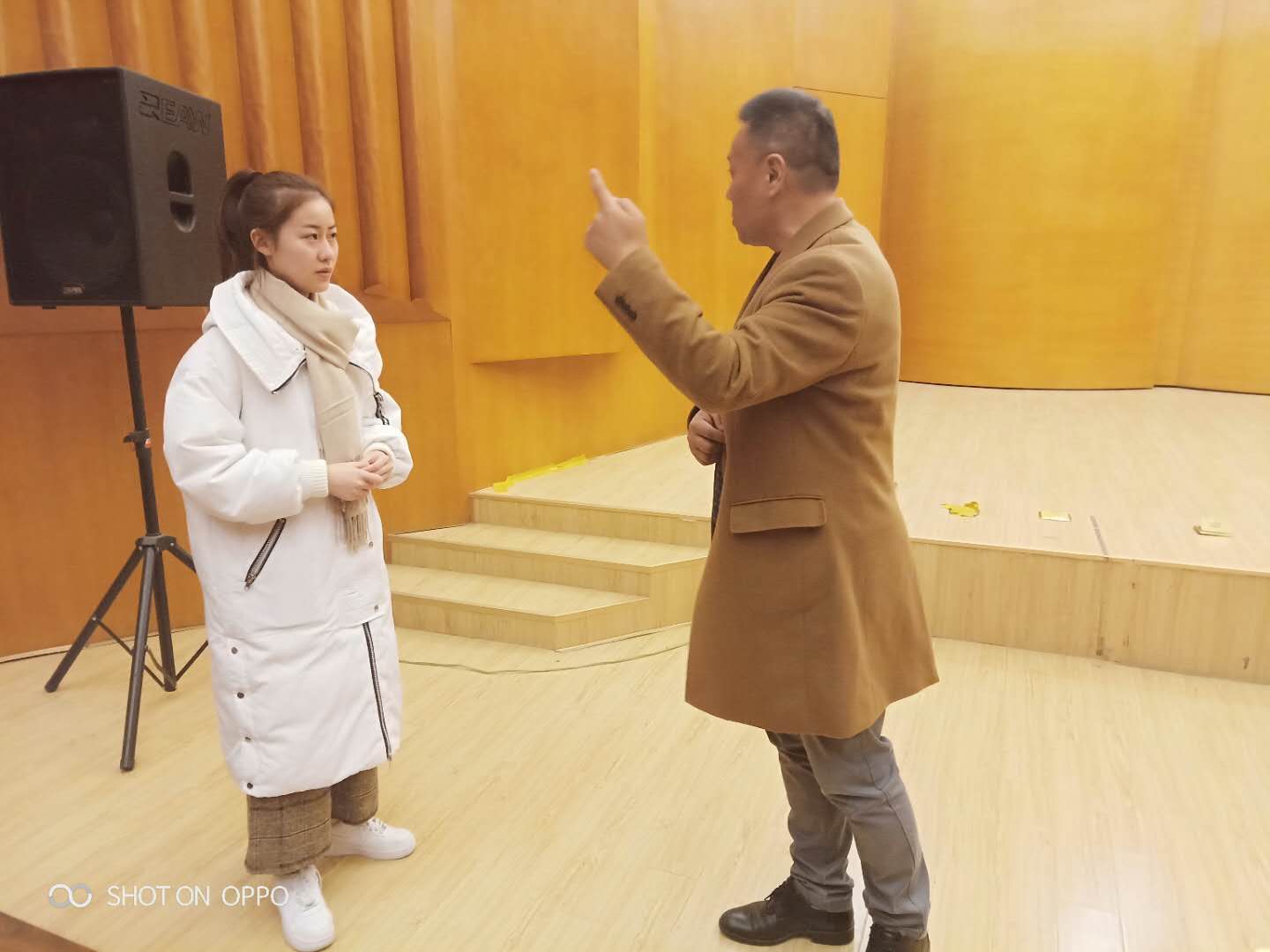 彭老师说,世界上有三大表演艺术系统,中国戏曲的舞台表演就是其中之一。“戏曲的舞台上不可直来直去,所以才有逢上必下,逢前必后,逢左必右。这就是戏曲‘圆’的艺术。”彭老师现场向大家示范了戏曲表演中“开门”的动作虚拟表现,并现场邀请两位同学学习表演动作,以诠释他口中“圆”的艺术理念。他说:“表演中的步法、手势和神态”是‘圆’的精髓。”两位同学一边认真观察老师的动作,一边模仿学习,台下的同学们也跃跃欲试,纷纷“出手”模仿。