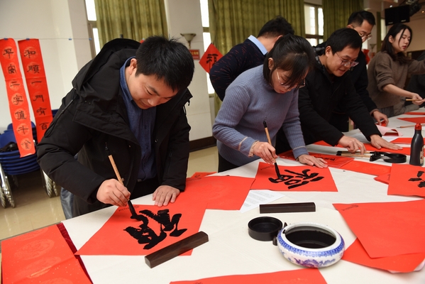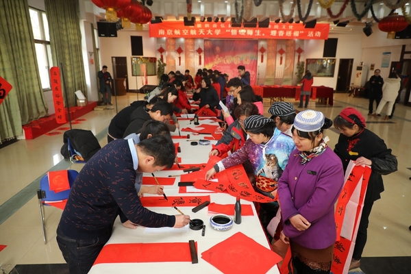 1月16日-17日,yl23411永利集团官网书法专业师生和永利集团官网老年书画研究会会员、砚湖书院学员等20余人,参加了由学校宣传部、校工会、yl23411永利集团官网、离退休处联合主办的“翰墨飘香弘扬中华优秀传统文化”暨南京航空航天大学“情暖师生,迎春送福”活动。在汉字的线条美与结构美之中传递出了浓郁的新春祝福,现场创作出上千幅春联、福字赠送给现场参与活动的师生员工与离退休老同志。