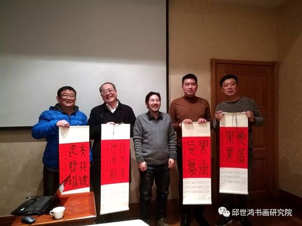 最后邱世鸿教授与部分代表合影,并赠送了书法挂历。晚宴之际更与大家进行了广泛的交流,并与部分企业的文化建设达成意向合作。