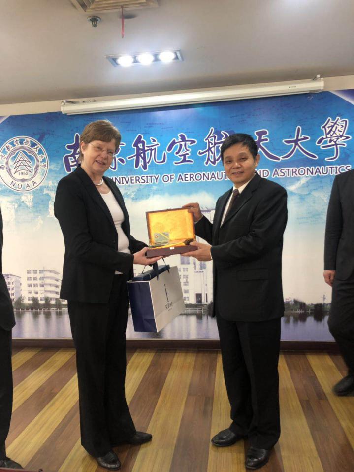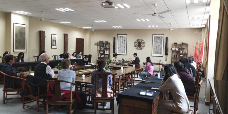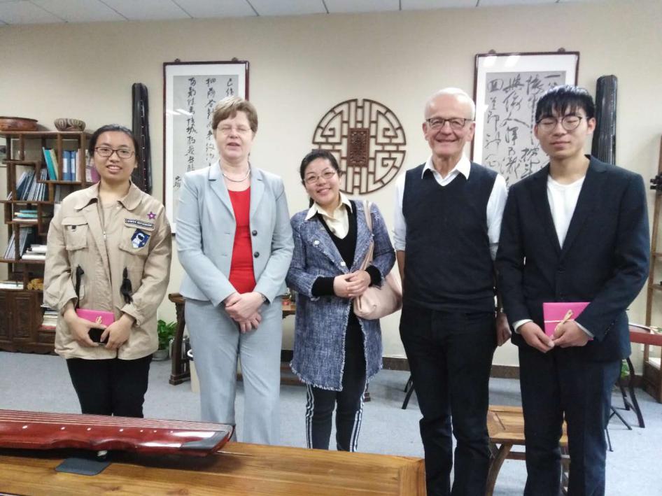 4月12日上午,应yl23411永利集团官网老师方璇博士邀请,汉诺威音乐戏剧和媒体大学校长Rode-Breymann教授和德国图宾根大学Erich Paulun院长Schmidt-Glintzer教授来到学yl23411永利集团官网,与yl23411永利集团官网师生在砚湖书院开展了一堂别开生面的教学互动交流课。教学互动交流课上,来自航天学院的邹助萱和航空学院的王宁悦两位中国学生向在场的嘉宾演绎了中国传统乐器-古琴二重奏。两位学生通过本学期选修yl23411永利集团官网方璇老师的《室内乐演奏实践》课程,在老师的指导下,将古琴传统乐曲《酒狂》进行了重新改编,融合了西方现代音乐特色及技巧,两位同学的二重奏展现出优雅的东方音乐魅力,受到了外宾的连连称赞和一致好评。外宾当场赠予礼物,并邀请两位学生去德国演奏,进行文化交流。两位外宾还与yl23411永利集团官网音乐学、美术学、设计学等专业的老师和学生展开了互动交流及学术研讨,气氛热烈友好。板俊荣副院长、邱爱金老师参加了本次活动。