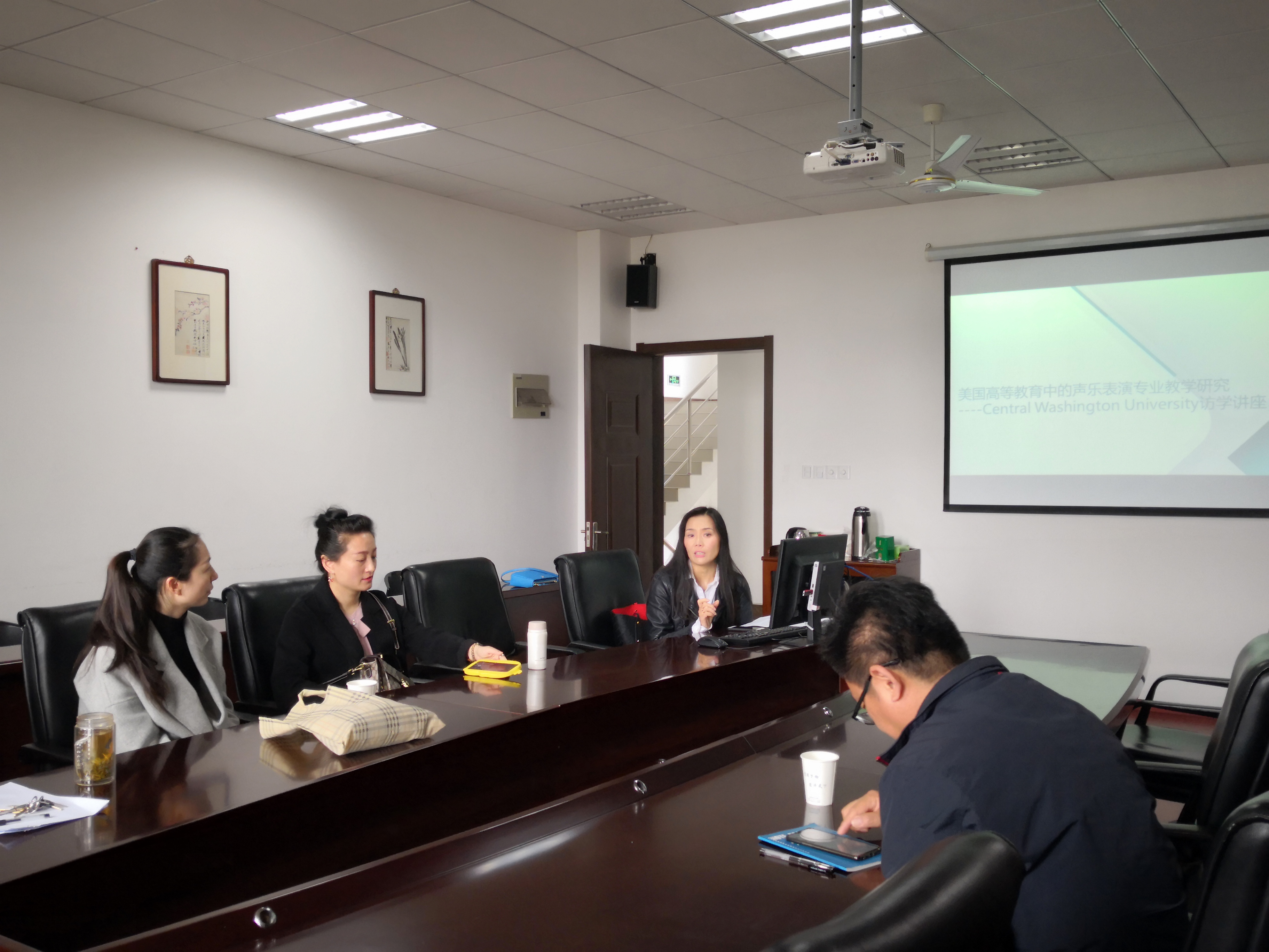 张进老师2018年3月至2019年3月在对中央华盛顿大学进行了为期一年的访学。她的报告首先介绍了中央华盛顿大学及其音乐专业概况。张老师指出,他们学校的学生在入学前的专业水平就普遍较高,且在入校后也很认真对待每位老师布置的作业,很少出现不完成作业的情况。其次对中央华盛顿大学音乐专业课程及教学活动做了介绍,课程从师资力量、教学内容、教学形式进行了详细的讲述,并和我院的情况进行了对比。张老师指出,中央华盛顿大学音乐专业的课程设置和我院差不多,只是在实践活动上比我们多很多,在他们那里让学生参与的力度更大,学生收获的东西就会更多。比如:他们要求本科生就要开专场音乐会,并且纳入到学分中去。张进老师还指出美国教育中的“自由开放”和“严谨统一”的辩证关系。美国对学生首先是自由开放的,可以任意转专业(只要通过考试),不歧视任何特殊情况的学生,但是对所有学生的学术要求都是一样的,没有人情可言。张进老师还对声乐专业课程设置以及实践情况,从教师专业性、课程实用性、学校全面性、师生互动性这四个方面做进一步的讲述。张老师在访学学习期间还举办了两场个人音乐会及各种合唱音乐会的排演。并且受到校方的一致好评。在音乐会后,张老师还收获了许多小粉丝,并且他们希望假期到中国来和张老师学习声乐。张进老师表示,虽然访学很辛苦,但是看到她的导师和其他老师们那么的热情,所有的付出都是值得的。