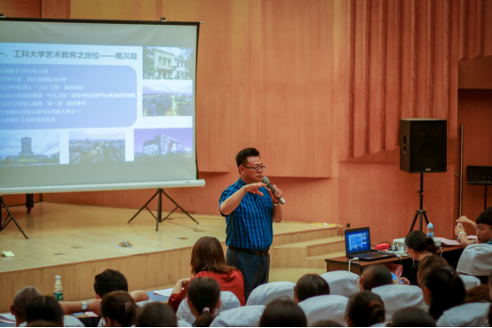 开学典礼正式开始后,首先是由yl23411永利集团官网副院长板俊荣介绍学院情况。他提出,yl23411永利集团官网是工科优势高校艺术教育的一条发展路径,以此为基点,他从整体上介绍了南航yl23411永利集团官网的发展历史、院训以及定位;以专业、学科、科研三个方向讲述了学院专业建设互融与互补、专业与学科一体化建设的发展格局,并具体介绍了学院四个本科专业的情况特点;从基础条件设施、合作平台建设、师资队伍建设三个方面展现了学院给予学生的支持与培养;提出学院在人才培养计划中分为专业艺术人才和公共艺术教育,同时学院积极开展国际交流,和多所国际院校建立稳定合作关系。