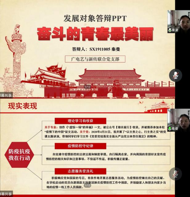 会议伊始,李爽系统的介绍了党员发展流程以及此次答辩的重要性。答辩第一个环节由学生进行自我展示,主要从入党动机、学生工作实践及未来将如何发挥先锋模范作用等三个方面进行阐释。第二个环节由评委提问,主要涉及个人思想、党建理论、时事政治、专业学习、实践活动等内容。答辩过程中,各位同学围绕对党的认识进行深度剖析,跟大家分享了在疫情期间的一些战“疫”工作,表示将以党员的标准严格要求自己,从思想上、行动上积极向党组织靠拢,充分发挥党员的先锋作用。