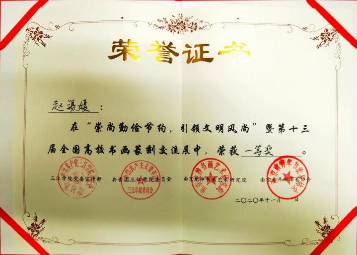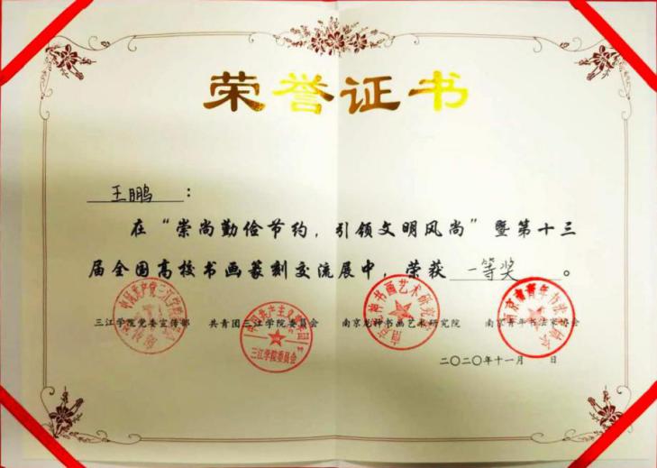 2020年11月4日,第十三届全国高校书画篆刻交流展在三江学院图书馆开展。此次展览,由共青团三江学院委员会主办,三江学院书画协会承办,驻宁高校书画协会联盟、三江学院党委宣传部、三江学院图书馆协办,由南京龙神书画艺术研究院和南京青年书法家协会为支持单位,展览时间为11月4日—11月10日。开展当日,汇聚了全国七省38所高校的作品,包括书法作品88副及绘画作品近百副,得到了龙神书画艺术研究院、中国书法家园网、南京市青年书法家协会以及南京林业大学、南京信息工程大学、长春建筑学院、东北大学、河北地质大学、阜阳师范大学、重庆师范大学、南京财经大学、南京航空航天大学、南京师范大学、南京邮电大学等单位和高校支持,经过评委老师现场评审和打分,永利集团官网yl23411永利集团官网邱世鸿教授的两名研究生王鹏、赵锡媛,均荣获一等奖。
