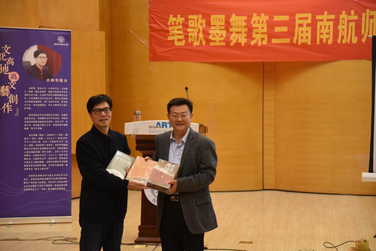 讲座开始前,章主席为学院捐赠了《故宫三部曲》、《大江之上》和《世纪江村》等文学作品;讲座中,章主席对我院举办的“笔歌墨舞”第三届南航师生画南航艺术作品联展给予充分肯定,总结了这次展览的思想性、主体性、艺术性与学校特色紧密结合,对我院在人才培养和办学理念给予充分肯定;讲座后,章主席与我院学生踊跃互动,就学习、创新和艺术素养提升等问题,给了学生较多建议。