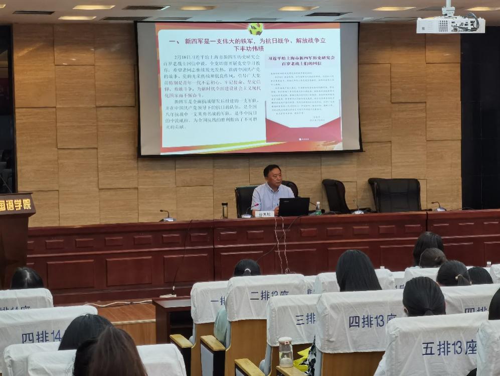 党课中,孙其松为同学们介绍了新四军的历史,指出在抗战期间,新四军英勇抗敌,浴血奋战,成为抗击侵华日军的中流砥柱。他以歌引题,为同学们播放了新四军军歌,解读“铁的信念,铁的意志,铁的团结,铁的纪律,铁的作风”的铁军精神,鼓励同学们要为新时代全面建设社会主义现代化国家贡献青春力量。