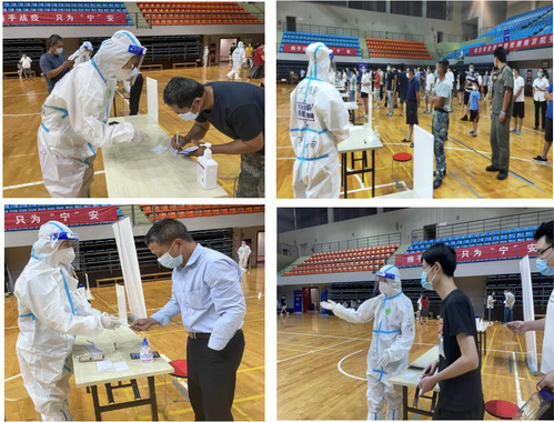 早上八点半,志愿者们在将军路校区体育馆集合,接受培训后换上防护服,从头到脚武装起来。“终于理解那个上门给人做核酸在楼下苦等无果后大哭的医护人员了!”在当天的朋友圈中,20级新闻与传播专业的硕士研究生田点这样写道,“穿上防护服的感觉像焖锅,穿了10分钟就感觉热到不行,手套褪下来后汗水直接拧成几股流下来了。”