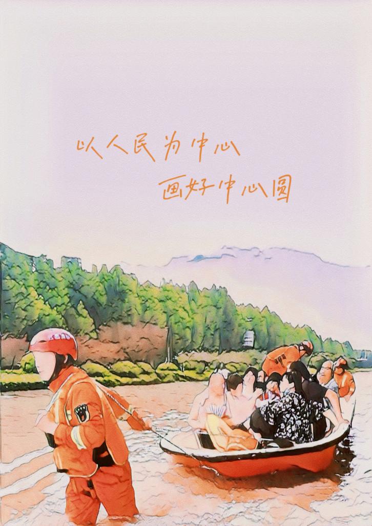 “为保证人民群众的安危,他们徒手拉着坐在船上的群众,趟着齐膝的水奋力向前,对于受困的老人和小孩他们更是义无反顾的背着、抱着他们艰难转移。”