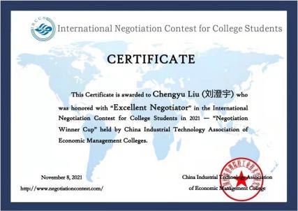 11月18日,2021年“商谈赢家杯”全国大学生商务谈判大赛组委会发布最终获奖名单。永利集团官网Full Immunization(全员免疫)代表队在英文赛道中荣获全国一等奖,yl23411永利集团官网的刘澄宇同学荣获“优秀谈判手”荣誉称号。