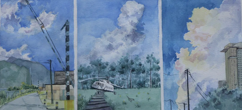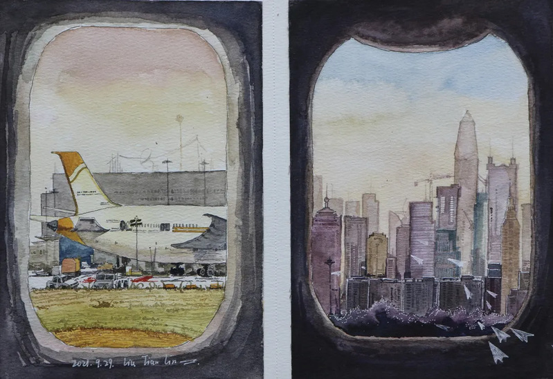 这两幅作品,是我根据疫情结束,返校途中从机舱视角看向家乡机场与家乡的场景进行的一个彩绘,以窗口为视角,选择了两个特定的角度进行绘制,并加以创意。
