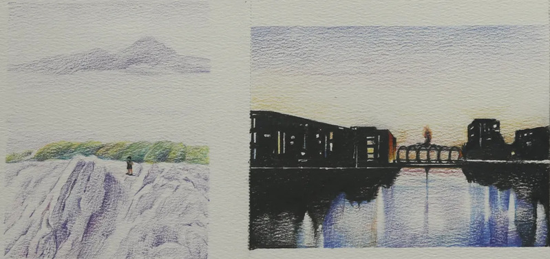 这次的作品基本都是描绘风景再加以人物或动物点缀,这些画面的原景都是来自生活,都是我走过的地方,用相机镜头记录下的地方。生活中观察的事物,在观察事物中找灵感。通过第一印象感觉它,然后根据这个印象加以想象丰富它并在纸上描绘它,给予它新的意义。添加的人物和动物灵感来源于之前看到过的一些插画书,在书里每一幅作品都是美的治愈的,从中可以感受到插画的故事感带来的感动,感受画中人事物的喜或悲。我也喜欢自然,热爱自然。身临山川大海,会觉得压力被舒缓了,靠近动植物也让我有莫名的愉悦感。