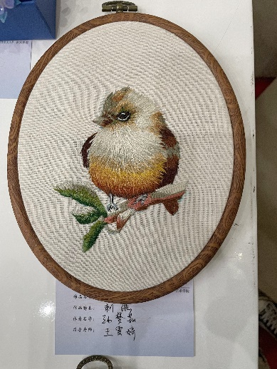 主要是运用打籽绣和普通刺绣,用不同的方法来表现不同物质的不同质感。颜色比较鲜艳,多运用了对比色突出中心。
