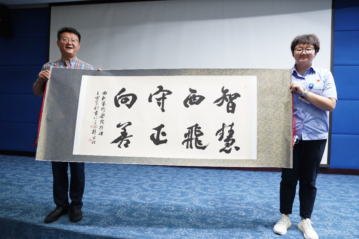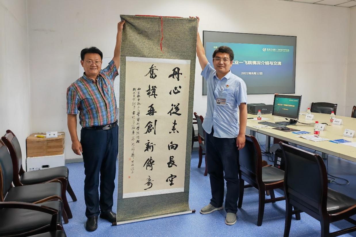 教师团队共同观看一飞院宣传片,参观了一飞院历史展览馆、虚拟现实实验室,感受一飞院“凌云为笔,情寄蓝天”的精神。学院以“丹心从来向长空,奋辑再创新传奇”为赠,希望加强校企联系,共书中国航空灿烂未来。