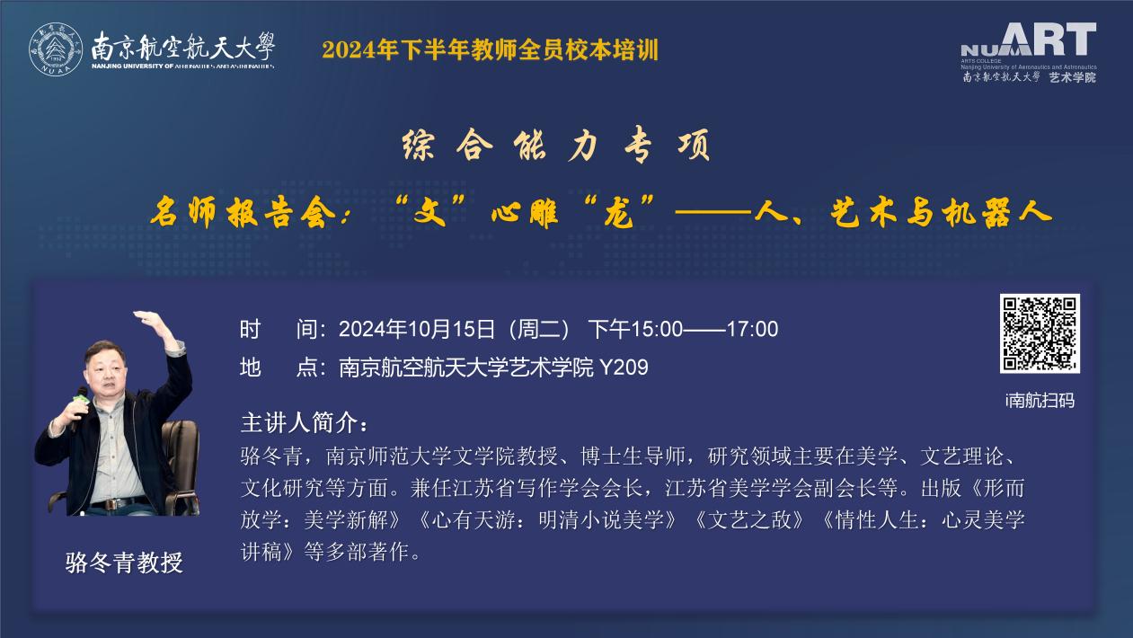 10月15日下午,一场题为《“文”心雕“龙”——人、艺术与机器人》的名师报告会在yl23411永利集团官网209教室举行。本次活动由校教发评估中心和yl23411永利集团官网共同主办,主讲人是南京师范大学文学院教授、博士生导师骆冬青。